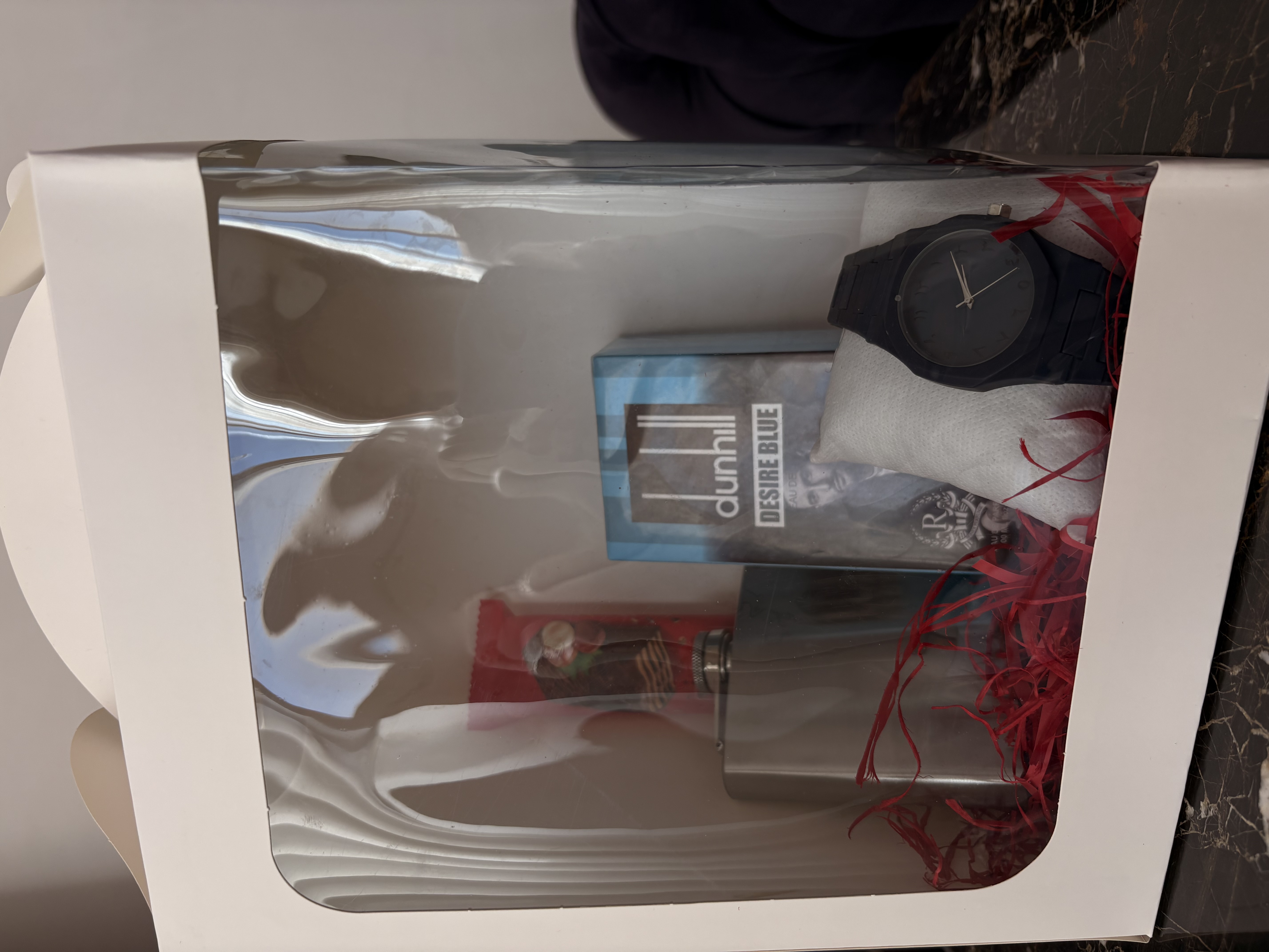 باکس خاص مردانه ایتم های داخل پک: ادکلن ۱۰۰میل ساعت فول رنگ سورمه ای بطری نوشیدنی فلزی خاص یک عدد شکلات